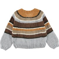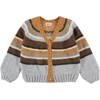 Gail er en grå og brun stribet strik cardigan. Cardiganen har v-udskæring, kort pasform og knappelukning.