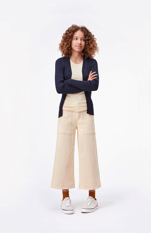 Genie er en mørkeblå lang cardigan med glimmer. Cardiganen har v-udskæring og knappelukning.