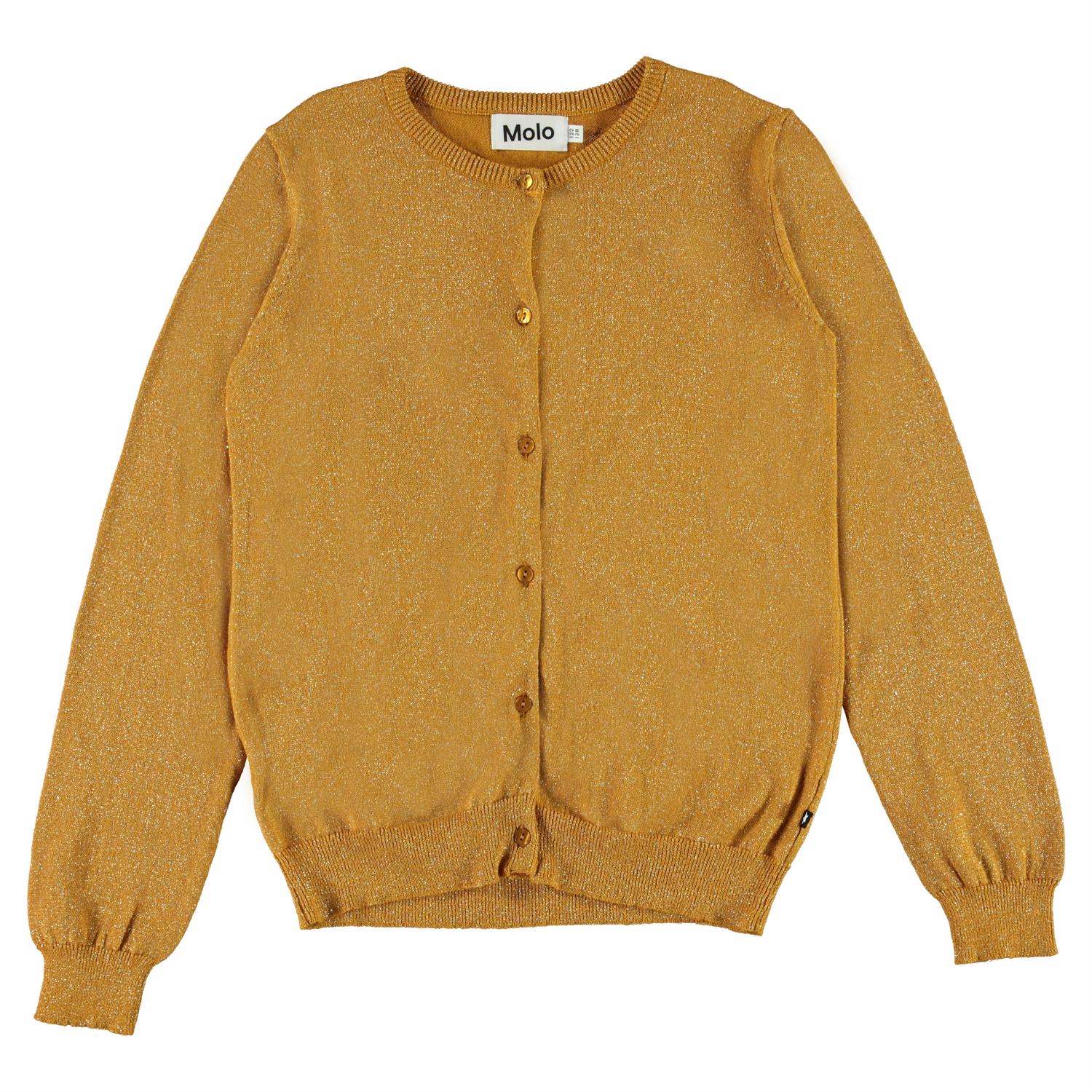 Georgina er en gylden bomulds cardigan med glimmer og knappelukning.