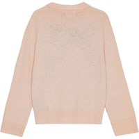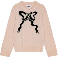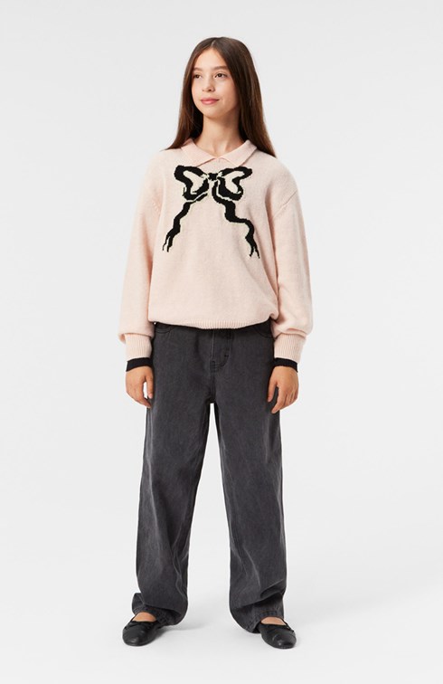 Blød uldblandet striktrøje i pudderfarve med normal pasform og rund halsudskæring. Ribkanter ved ærmer og bunden giver en fin finish. Trøjen har en elegant strikket krave og en stor sort sløjfe på forsiden, der tilføjer et sofistikeret touch.