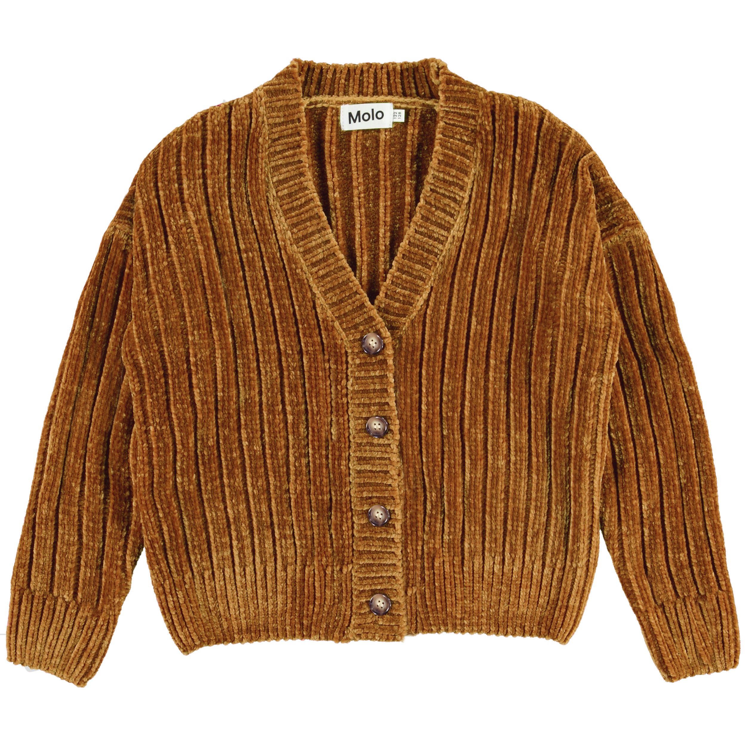 Gianna er Molo's nye chenille strik cardigan i en flot sennepsgul farve. Cardiganen har v-udskæring, kort pasform og knappelukning.