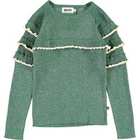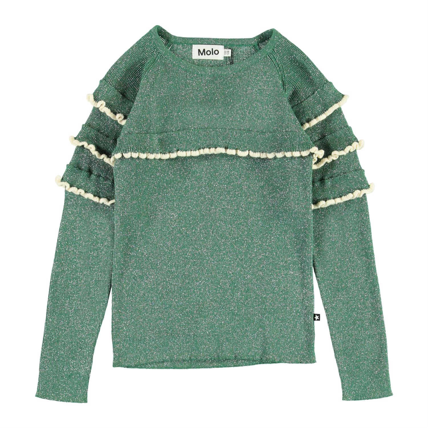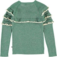 Gilah er en grøn glimmer bluse med lange ærmer med flæser.