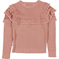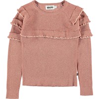 Gilah er en bluse i rosa med glimmer. Gilah har flæser over bryst og på ærmer.