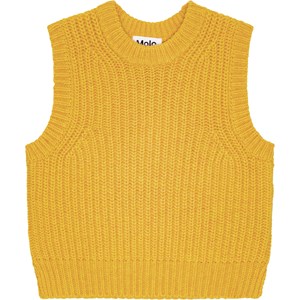 Gul strikvest i blød uld/akryl-blanding. Perfekt til at lægge over kjoler, skjorter og bluser for et ekstra cool lag til dit outfit. Vesten har en rund halsudskæring med rib, ribkant ved ærmegab og hofte. Den har også en normal pasform.