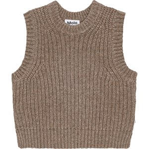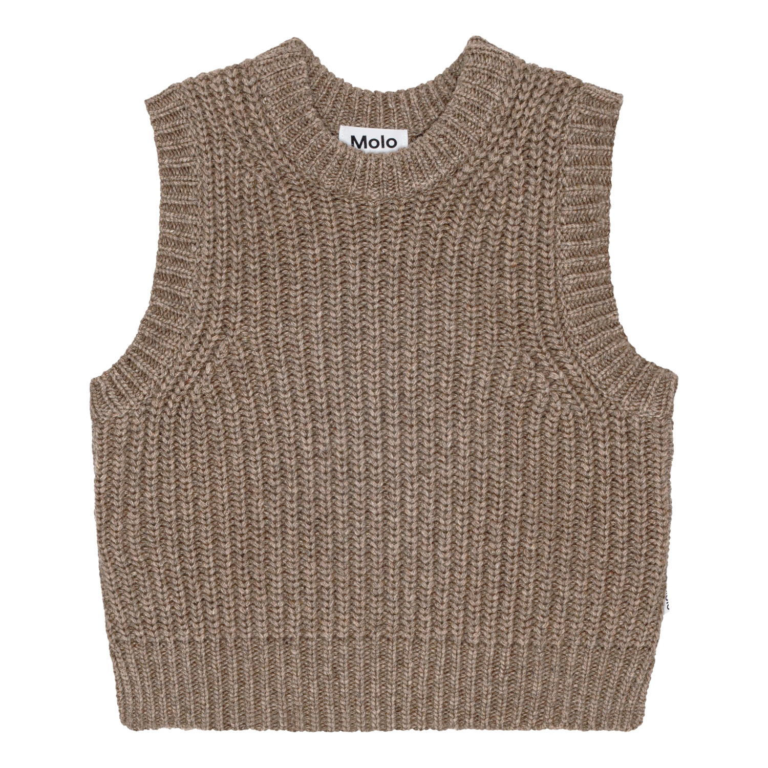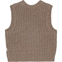 Kamelbrun strikvest i blød uld/akryl-blanding. Perfekt til at lægge over kjoler, skjorter og bluser for et ekstra cool lag til dit outfit. Vesten har en rund halsudskæring med rib, ribkant ved ærmegab og hofte. Den har også en normal pasform.