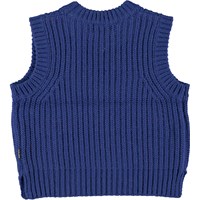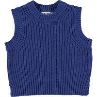 Mørkeblå chunky strikvest - Perfekt til udover kjoler, skjorter og bluser, som et ekstra cool lag til dit outfit. Denne strikvest er fremstillet i en uld/akryl blanding, har en rund halsudskæring med rib, ribkant ved ærmegab og hofte, samt et regulært fit.