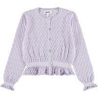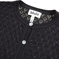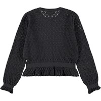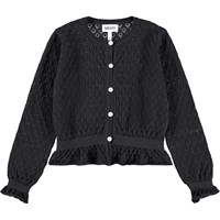 Feminin sort cardigan i økologisk bomuld. Denne cardigan har flot blomstervævet hulmønster, rib i taljen og ved ærmerne for flot pasform samt let rynket afslutning ved ærmerne og ved cardiganens bund.