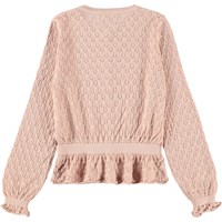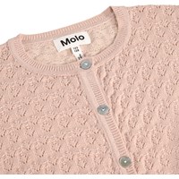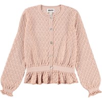 Rosa cardigan i blød økologisk bomuld med blomstervævet hulmønster. Cardiganen har ribkanter i taljen og ved ærmerne, hvilket giver en flot og velsiddende pasform samt en bund der afsluttes med lette rynkedetaljer.