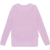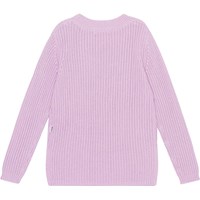 Pastel lilla langærmet striktrøje i blød økologisk bomuld. Mønsteret er strikket i ribstrik med fine ind- og udtagninger og har ekstra længde bagtil samt slids i siderne.