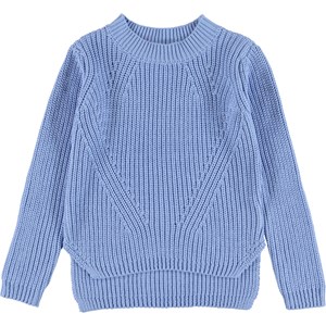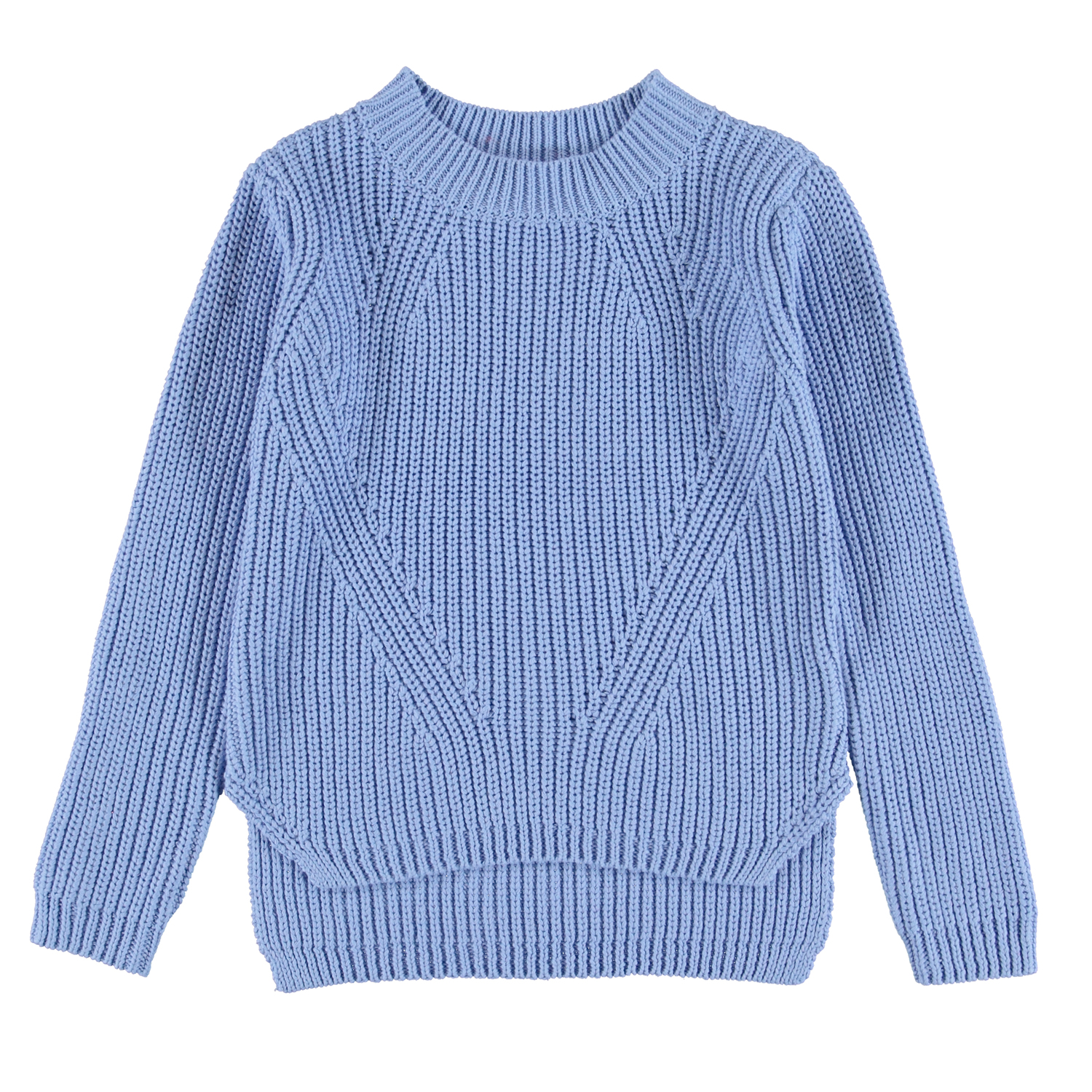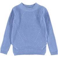 Gillis er en blå bomulds strikbluse med lange ærmer. Blusen har rund hals og fint strik mønster.