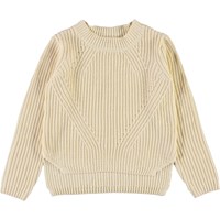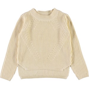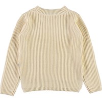 Gillis er en lysegul bomulds strikbluse med lange ærmer. Blusen har rund hals og fint strik mønster, samt mere længde bagtil og kort i siderne.