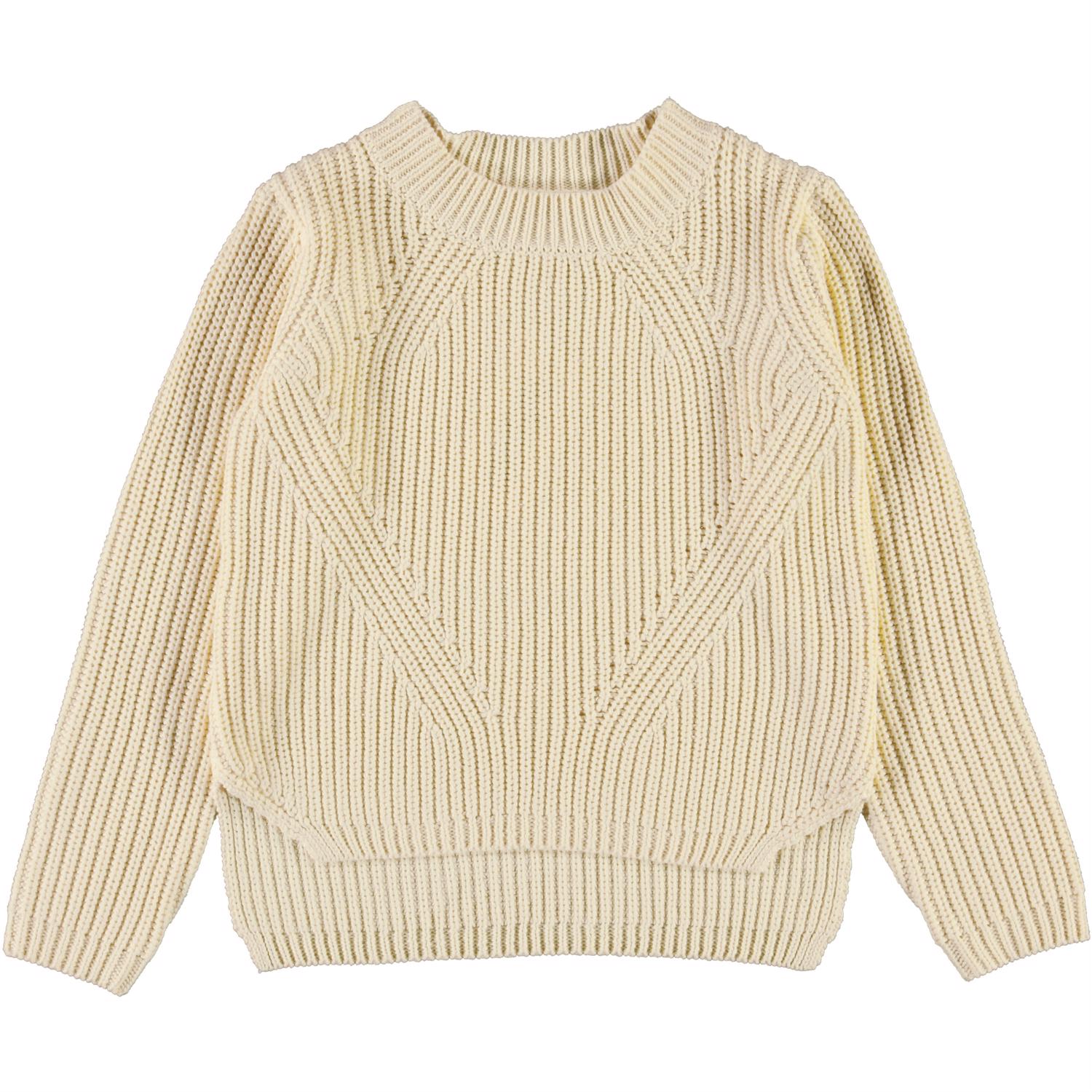 Gillis er en lysegul bomulds strikbluse med lange ærmer. Blusen har rund hals og fint strik mønster, samt mere længde bagtil og kort i siderne.