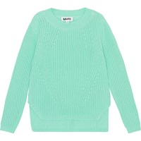 Mintgrøn langærmet striktrøje i blød økologisk bomuld. Mønsteret er strikket i ribstrik med fine ind- og udtagninger og har ekstra længde bagtil samt slids i siderne.