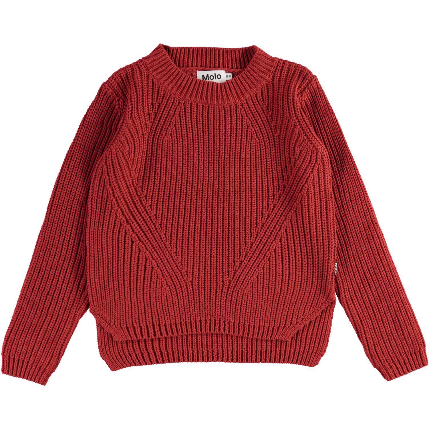 Gillis er en mørkerød bomulds strikbluse med lange ærmer. Blusen har rund hals og fint strik mønster. Blusen er fremstillet af økologisk certificeret bomuld.