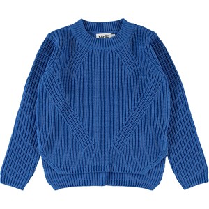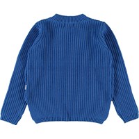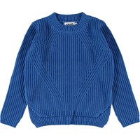 Gillis er en blåp bomulds strikbluse med lange ærmer. Blusen har rund hals og fint strik mønster, samt mere længde bagtil og kort i siderne.