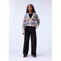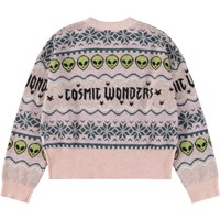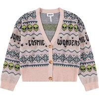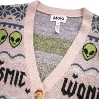 Flot multifarvet cardigan i en uld- og alpakablanding. Denne cardigan er strikket i flot farvestrålende mønster, inspireret af nordisk strikkehistorie med små alien og teksten ''Cosmic Wonder''. Cardiganen har V-udskæring, ribafslutning og fine knapper foran.
