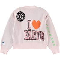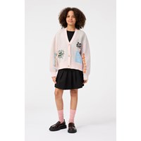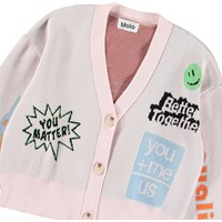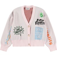 Lyserød cardigan i blødt økologisk bomuld med løs pasform, V-hals, knaplukning foran og lange ærmer med ribkanter samt ribkant i bunden. Cardiganen er fyldt med positive udsagn og budskaber i flotte farver.