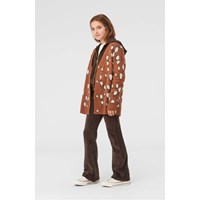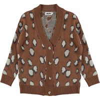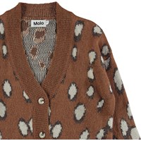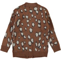 Gina er en lang brun strik cardigan med hvide pletter. Cardiganen har knappe lukning på fronten og v-udskæring.