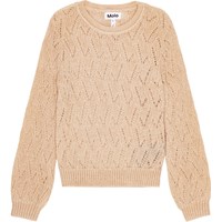 Lys ferskenfarvet striktrøje i alpaca uld/uld blanding. Trøjen har et fint hulmønster og lange ærmer med volumen. Den har en rund halsudskæring med rib og ribkanter ved ærme og hofte. Trøjen har et regulært fit og er perfekt til hverdagsbrug.