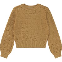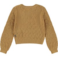 Støvet gul striktrøje med hulmønster. Denne striktrøje er fremstillet i en alpaca uld/uld blanding, har et fint hulmønster, har lange ærmer med volume, en rund halsudskæring med rib, ribkant ved ærme og hofte, samt et regulært fit. Den perfekte hverdagsstrik.