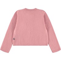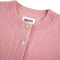 Blød rosa cardigan i børstet uld for et fluffy look. Denne cardigan har fin afslutning ved ærmer og i bunden, samt ribkant i halsudskæringen samt praktisk knaplukning foran.