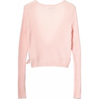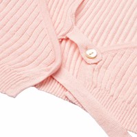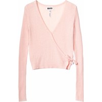 Lyserød slå-om cardigan i en blød, strækbar ribstrik. Cardiganen er tætsiddende med bindebånd og knap i siden, hvilket gør den nem at få af og på.
