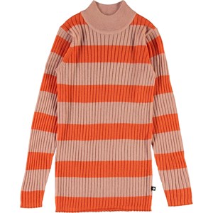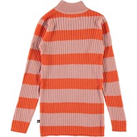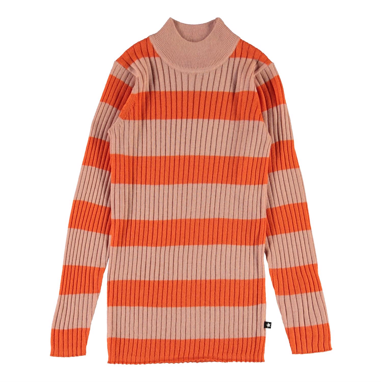 Gitte er en orange og rosa stribet tynd strik bluse med høj hals.