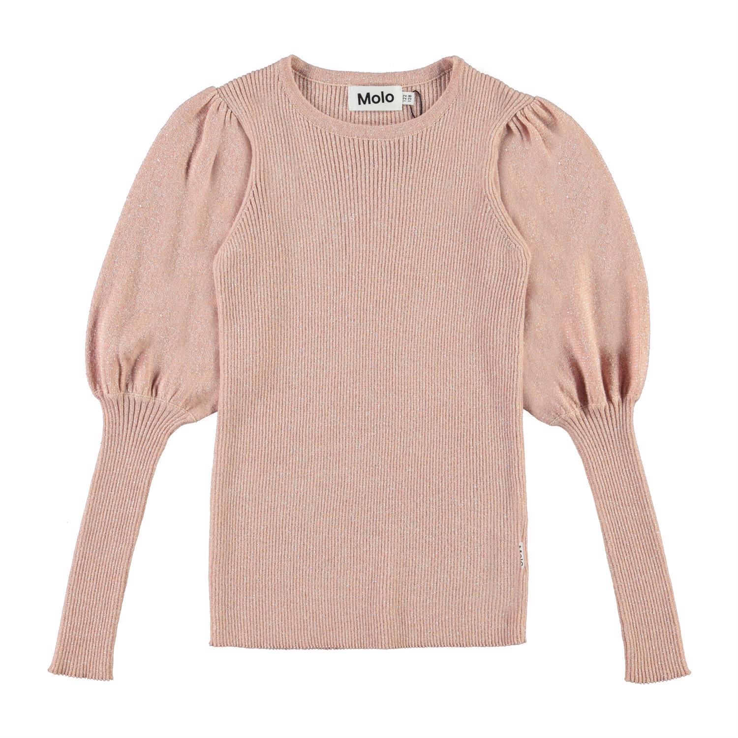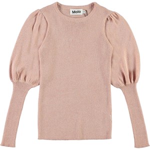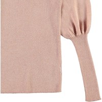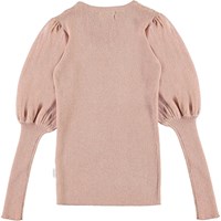 Glenda er en rosa strikbluse med lange ærmer med masser af puf i foroven. Blusen er i rib strik med glimmer tråd, som gør den ekstra elegant.