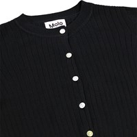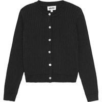 Sort cardigan i økologisk bomuld, finstrikket i en bred rib med lange ærmer. Cardiganen har en rund halsudskæring, knapper ned langs fronten, ribkanter, og en almindelig pasform.