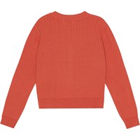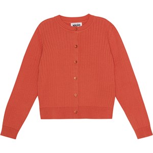 Rød cardigan i blød økologisk bomuld. Finstrikket i en bred rib med en smallere ribkant ved den runde halsudskæring, ærmer og forneden. Cardiganen har lange ærmer og knapper fortil samt en god pasform.