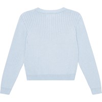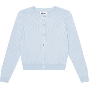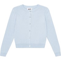 Pastel blå cardigan i blød økologisk bomuld. Finstrikket i en bred rib med en smallere ribkant ved den runde halsudskæring, ærmer og forneden. Cardiganen har lange ærmer og knapper fortil samt en god pasform.