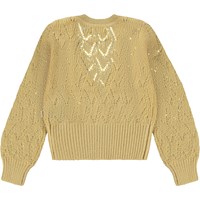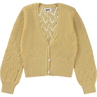 Støvet gul strikcardigan med hulmønster. Denne cardigan er fremstillet i en alpaca uld/uld blanding, har et fint hulmønster, dyb halsudskæring med ribkant, knaplukning på fronten med rib på stolpen, lange ærmer med volume, ribkant ved ærme og hofte, samt et regulært fit. Brug den som ekstra lag på de koldere dage, eller udover en kjole for et cute look.