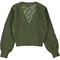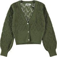 Glory er en strikket cardigan i grøn, med 3 perlemors knapper. Glory har voluminøse ærmer og er strikket med et fint hulmønster, der giver et cool look. Cardiganen har en bred ribkant i bundet og for enden af ærmerne.