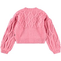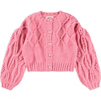 Tyk pink cardigan i alpaka uldblanding. Denne cardigan har et flot vævet mønster, voluminøse ballonærmer og fine knapper foran. Cardiganen har ribkant ved halsudskæringen, samt ved ærmer og i bunden.