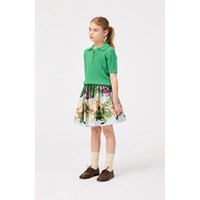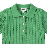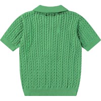 Grøn strikket t-shirt i blødt økologisk bomuld. T-shirten har en klassisk krave, ribkanter ved ærmer, hofte og stolpelukningen, som er med tre perlemorsknapper. T-shirten er strikket i et smukt hulmønster, der giver et eksklusivt look.