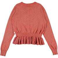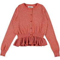 Grit er en rød cardigan med glimmer. Cardiganen har knappelukning og indsnævring ved taljen, samt feminint draperet bund.
