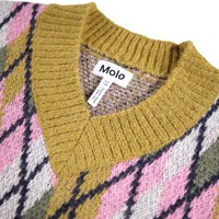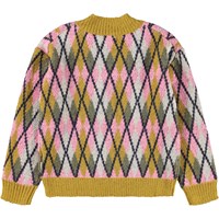 Rosa strik i alpaka-uldblanding. Strikken har raglan ballonærmer, højhalset ribkrave og lang rib ved ærmerne, samt ribkant i bunden af strikken.