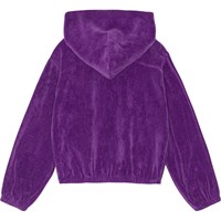 Lilla velour hættetrøje med Molos broderet hjerte kløver ved brystet. Hættetrøjen har en lynlåslukning i sølv, elastik i bunden samt ærmerne, der gør den nem at komme i og behagelig at have på.