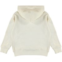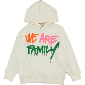 Madelyn er en hvid hættetrøje med teksten 'Family' i tre farver, som ligner det er spayet på.