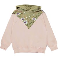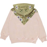 Magda er en rosa hættetrøje som har en grøn overdel med blomster print, der går ned i en spids både foran og bagpå.