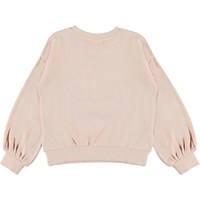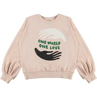 Malena er en rosa sweatshirt med print af to hænder og teksten 'One world, one love'. Sweatshirten har en kort pasform og let puffede ærmer. Certificeret af Ecocert Greenlife, certifikationsnr. 197496.