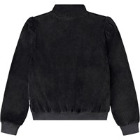 Sort cardigan i blød velour. Cardiganen har lynlås, lommer i siden med detaljerede lommeklapper, rynker ved skuldrene og en bred ribkant ved ærmerne og i bunden. Kombiner cardiganen med matchende bukser for at skabe et fuldendt og behageligt velour-sæt.