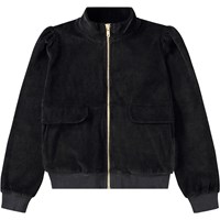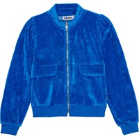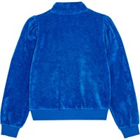 Blå cardigan i blød velour. Cardiganen har lynlås, lommer i siden med detaljerede lommeklapper, rynk ved skulderen og en bred ribkant ved ærmerne og bunden. Kombiner cardiganen med matchende bukser for at skabe et fuldendt og behageligt velour-sæt.