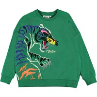 Mandy er en grøn sweatshirt med farverigt broderi af en tiger på fronten. Sweatshirten har raglan ærmer, samt ribkant ved hals, bund og ærme afslutning.