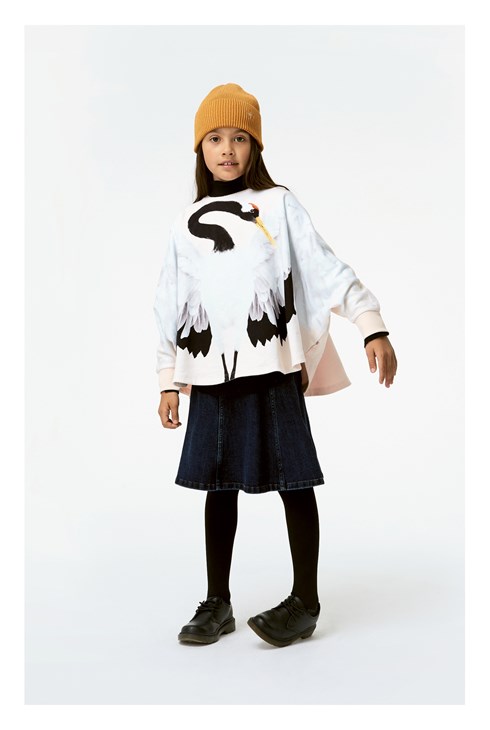 Marcella er en lys rosa poncho med print af en trane på fronten, som spreder vingerne ud. Blusen har ribkant ved hals og ærmeafslutning. Størrelserne svarer til: S= 2-4 år M= 5-7 år og L= 8-12 år.