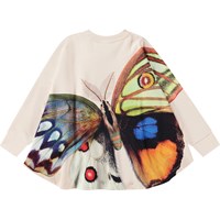 Marcella er en oversize poncho i økologisk bomuld. Den er råhvid og har en rundhals samt ribkanter ved håndleddene. Ponchoen har et front- og bagprint af en stor farverig sommerfugl, der folder sine vinger ud og viser alle sine smukke former og farver.