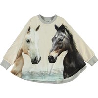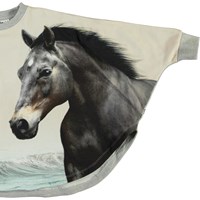 Marcella er en poncho med print af to flotte heste på fronten. Ponchoen har en grå bagside. Størrelserne svarer til: S= 2-4 år M= 5-7 år og L= 8-12 år.