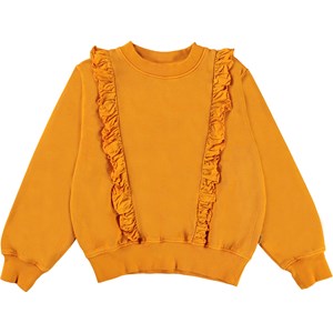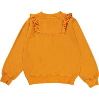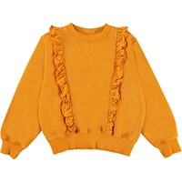 Marcia er en gylden orange sweatshirt med fine flæsekanter på fronten.