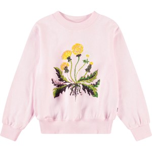 Lyserød sweatshirt i blødt økologisk bomuld med ribkanter ved hals, ærmer og i bunden. Sweatshirten har en løs pasform, med et farverigt palietbroderi på fronten af gule mælkebøtteblomster.