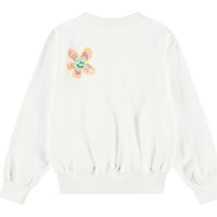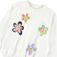 Hvid sweatshirt i blødt økologisk bomuld med ribkanter ved hals, ærmer og i bunden. Sweatshirten har en løs pasform med farverige, smilende palietblomster.
